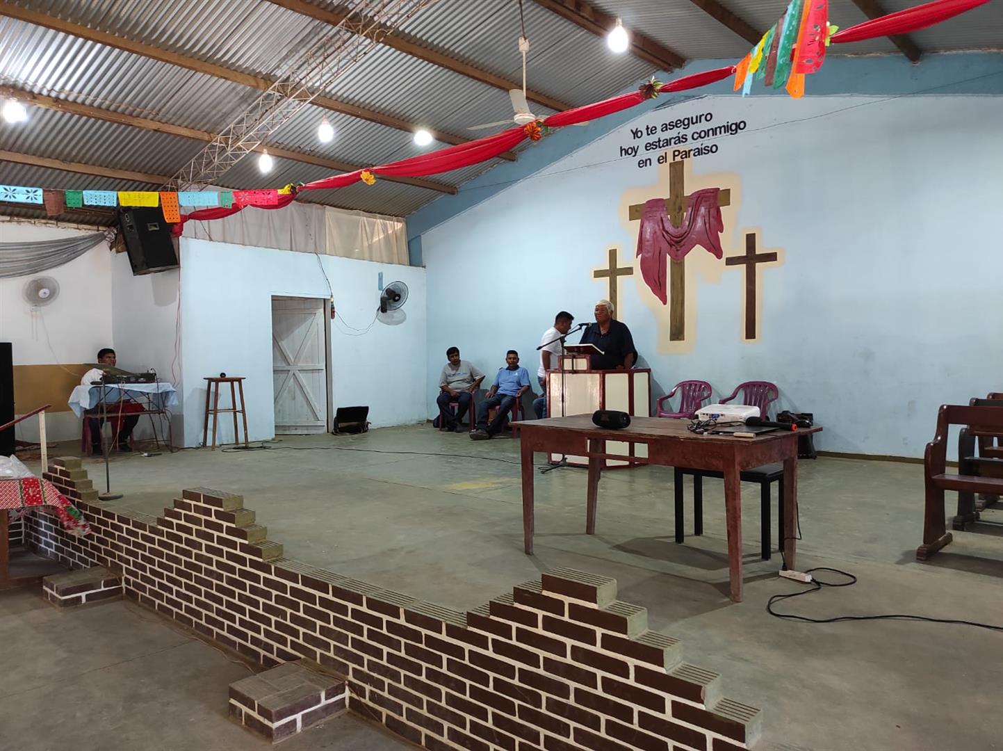 Después de saludar a los miembros de la iglesia y de la comunidad, el pastor dio inicio al culto con la presentación de los visitantes, agradeciendo a la directiva de la ASCIM por la visita. Después de algunas canciones conjuntas, acompañada por varios instrumentos, el señor Franz presentó a cada uno de los integrantes del grupo que le acompañó para esta ocasión. Luego, dio la palabra al gerente del DISE, el Sr. Adolf Harder, para dar una reflexión basada en el pasaje bíblico de Efesios 2:11-18.
