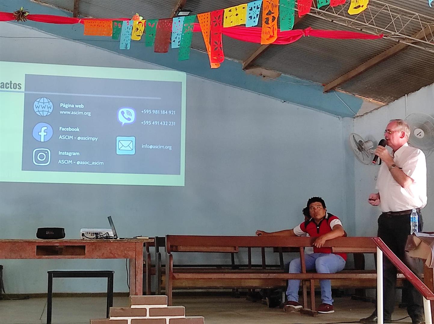 Seguidamente, el Sr. Franz compartió con los presentes el modelo de trabajo de la ASCIM, mediante un video institucional de la organización y una exposición más detallada con los aspectos y departamentos de la ASCIM. Luego, los participantes del culto aprovecharon el espacio para dirigir algunas preguntas a los directivos de la ASCIM.