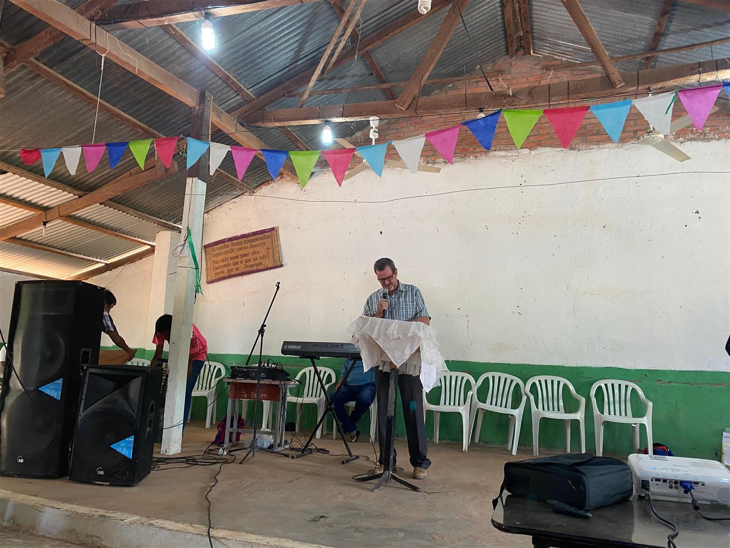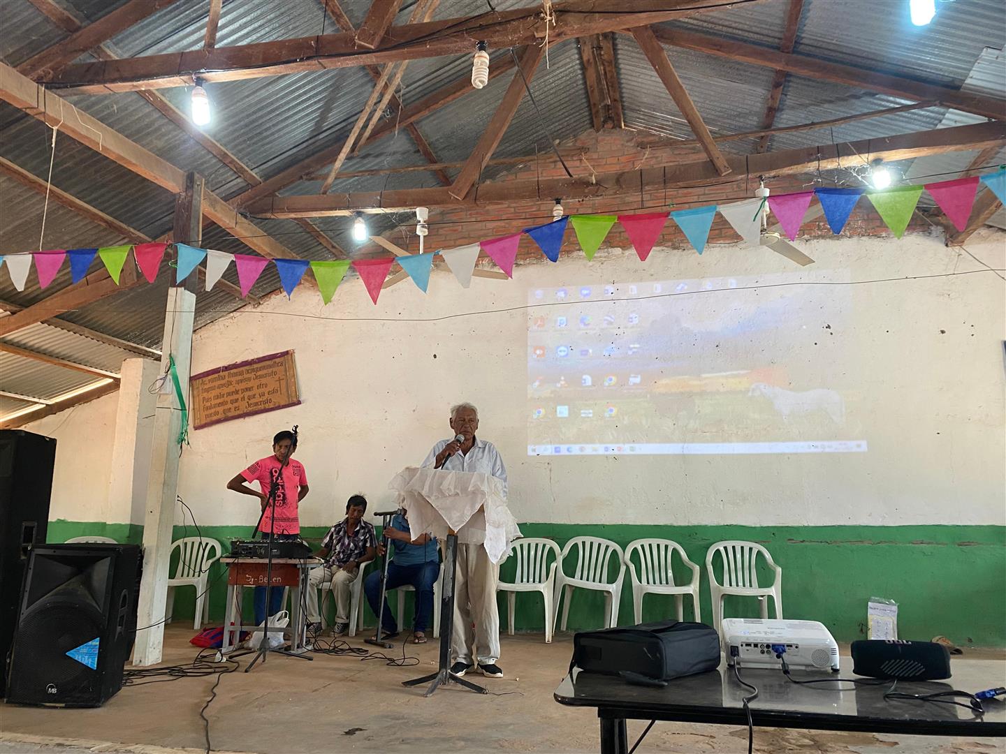 Con unas introducciones e informaciones de parte del secretario de la iglesia, Sr. Serafino Fernández, y unas canciones conjuntas, se dio inicio al culto dominical. Luego, el Sr. Francisco Castillo brindó una reflexión en el idioma enlhet acerca del pasaje bíblico de 2da de Pedro 4:12-13: “Amados, no os sorprendáis del fuego de prueba que os ha sobrevenido, como si alguna cosa extraña os aconteciese, sino gozaos por cuanto sois participantes de los padecimientos de Cristo para que también en la revelación de su gloria os gocéis con gran alegría.”