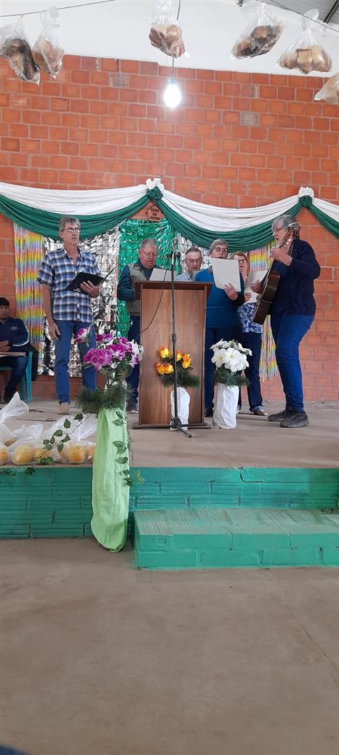 Después de saludar a los miembros de la iglesia y de la comunidad, el pastor dio inicio al culto con la presentación de los visitantes, agradeciendo a la directiva de la ASCIM por la visita. Después de algunas canciones conjuntas, acompañada por varios instrumentos, el señor Franz presentó a cada uno de los integrantes del grupo que le acompañó para esta ocasión. Luego, dio la palabra al gerente del DISE, el Sr. Adolf Harder, para dar una reflexión basada en el pasaje bíblico de Efesios 2:11-18.