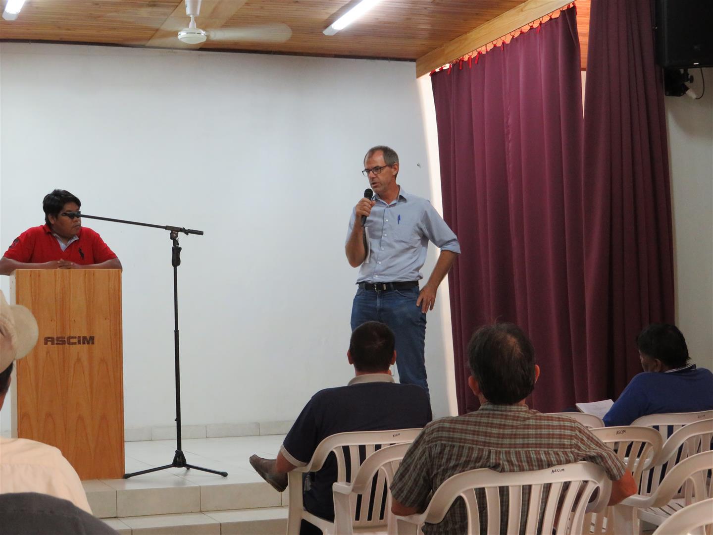 Luego, el asesor rural de la comunidad Enlhet Yalve Sanga, el Sr. Hartmut Wiebe, presentó a la comunidad mencionada. Recalcó que la comunidad cuenta con casi 6.000 hectáreas de tierra y con alrededor de 2.000 personas. Informó que cuenta con una estancia comunitaria con 845 cabezas de ganado, un parque de máquinas, un camioncito y una camioneta. Además, comentó que en la comunidad funciona un almacén de consumo bastante amplio con nueve empleados.